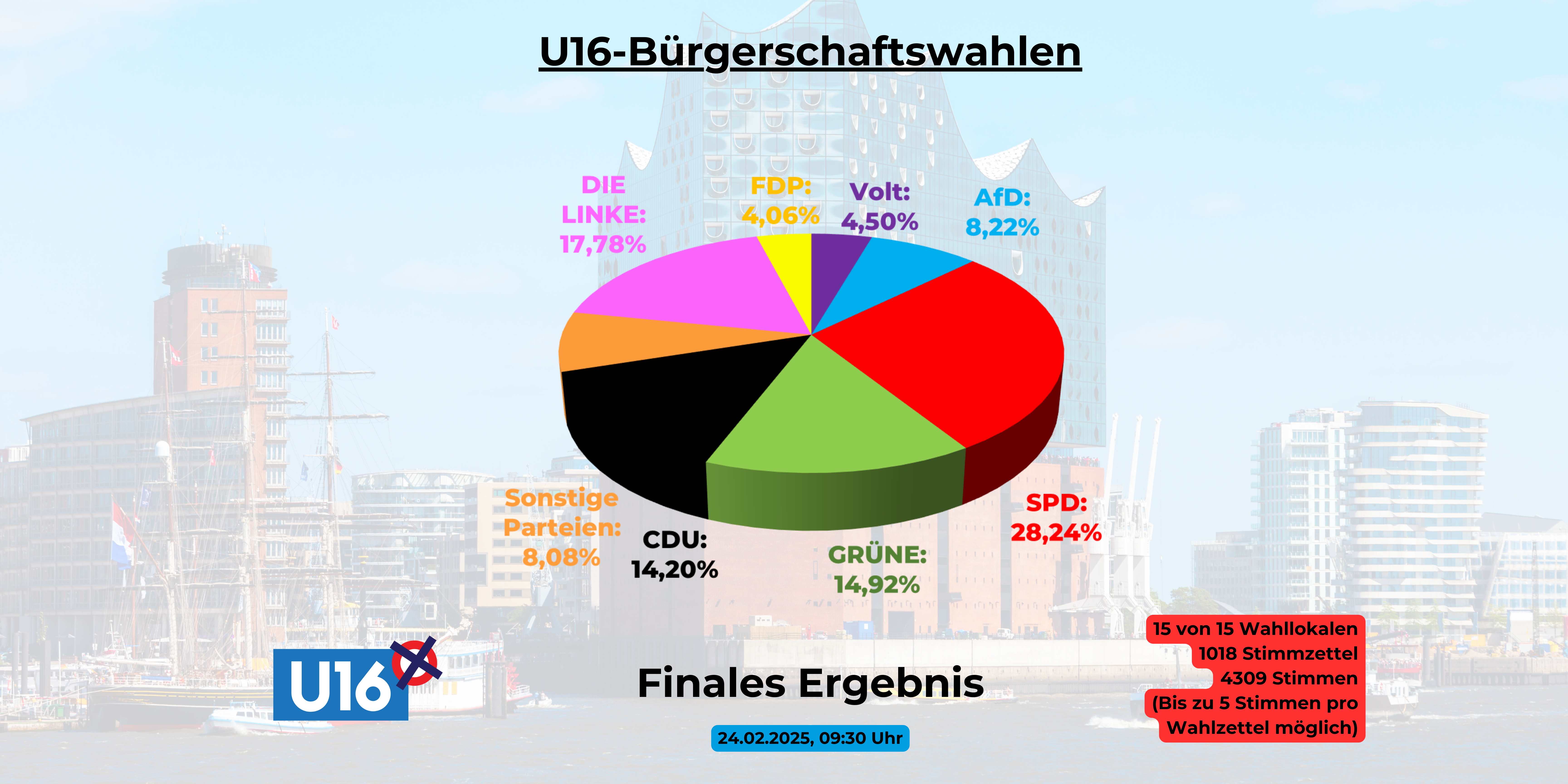 SPD und Linke gewinnen die Hamburger U16-Bürgerschaftswahlen. Nach Auszählung von 1018 Stimmen junger Hamburger in 15 Wahllokalen der U16-Bürgerschaftswahl liegen folgende Ergebnisse vor: SPD                           28,24 % Die Linke                  17,78 % GRÜNE                     14,92 % CDU                          14,20 % AfD                           8,22 % Volt                         4,5 % FDP                         4,06 % Sonstige                  8,08 %